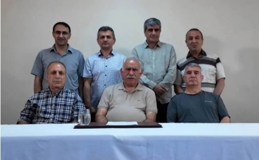 En la imagen Abdullah Öcalan y dirigentes anuncian la disolución del PKK en julio del 2025