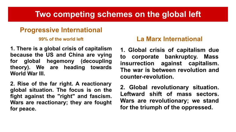 We conclude here this first part of the document intended to demonstrate the populist-front behavior of the self-proclaimed "Trotskyist" currents . We could add more examples from other countries, but that would be redundant, because these examples generally encompass all the currents. In the second part of this material, we evaluate the processes unleashed by the development of the global crisis of the left, a phenomenon that any activist can readily observe, but which only we at La Marx International analyze to provide a scientific explanation for the origin of the crisis and the necessary guidance for overcoming it. No other current in the world offers any kind of explanation for what is happening to the global left.