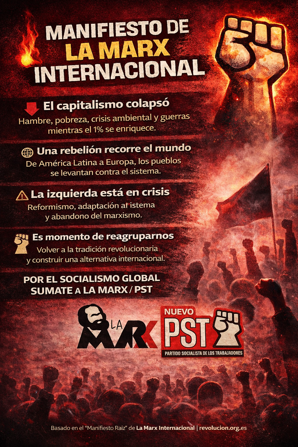 La combinación del colapso del capitalismo y el levantamiento revolucionario ha provocado que millones de activistas de todo el mundo se sientan atraídos por el marxismo. En todos los movimientos sociales y populares, en el feminismo, en los sindicatos, en la juventud, en las razas y pueblos más pobres y oprimidos, el marxismo y el socialismo crecen en simpatía. Así se entierran las campañas del "Fin del socialismo", "Fin de la historia", "Fin del marxismo", y toda la charlatanería de pseudointelectuales, que dijeron que el marxismo murió. Marx vuelve y "Un fantasma acecha al mundo", uniendo a millones de activistas en una Internacional Socialista. Es hora de unirnos y avanzar en una reagrupamiento internacional. La Marx es una herramienta de reagrupamiento basada en la tradición marxista para imponer el Socialismo Global.