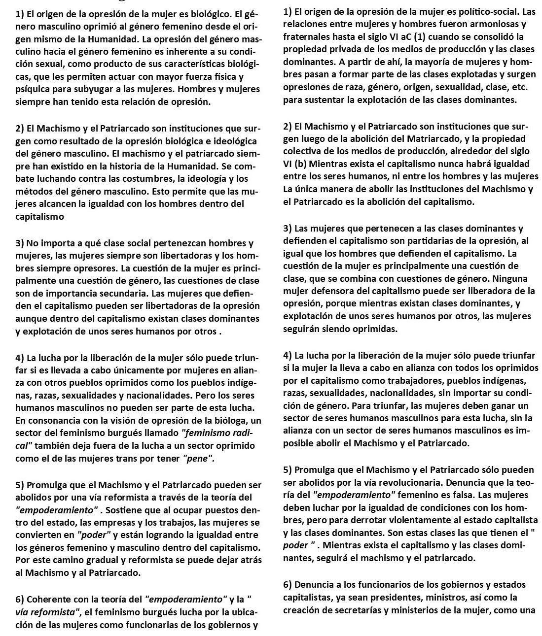 Para comenzar a construir un programa correcto respecto de la Mujer, lo primero es tomar consciencia del desarrollo histórico para exterminar los falsos conceptos transmitidos por quienes falsificaron la historia al servicio de los explotadores, la conservación de la sociedad de clases y el Patriarcado. Esta visión científica de la sociedad permite desterrar la idea de que diferencias raciales y sexuales son "naturales". Es exactamente lo contrario, las categorías de "raza" o "sexo" superiores o inferiores, la "inferioridad" femenina, o de determinadas razas, son categorías sociales.